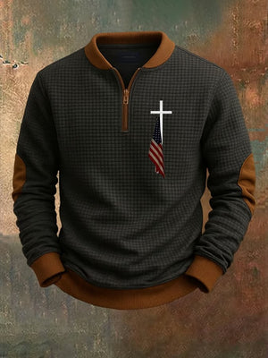 Men's Cross Flag Print Design Jacquard Fabric Zipper Stand Collar Sweatshirt